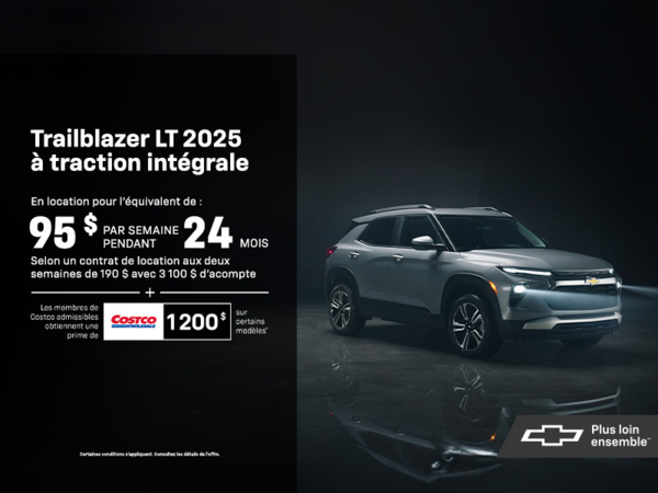 L'offre d'achat au comptant est basée sur le modèle 2024 CHEVROLET Trailblazer LS TAV (1TR56 5b9001e54d00), avec moteur 1,2L 3 cyl. et transmission CVT. Le prix de vente à l'achat au comptant est de 28 799,00 $ (plus taxes). Le prix de vente (28 799,00 $) à l'achat au comptant inclut: Transport (2 000,00 $), Taxe d'accise sur le climatiseur (100,00 $) installation comprise. Plus (TVH) et immatriculation. L'offre de financement est basée sur le modèle 2024 CHEVROLET Trailblazer LS TAV (1TR56 5b9001e54d00), avec moteur 1,2L 3 cyl. et transmission CVT. Offre de financement d'une periode limitée sur approbation de crédit. Les taux et les exigences peuvent varier en fonction de la solvabilité. Les paiements et conditions peuvent différer pour une utilisation commerciale. Certains client ne pourront se qualifier. Les taxes applicables sont calculées sur le montant total avant déduction de l'acompte. Le prix de vente en financement est de 28 799,00 $ (taxes en sus). Les paiements en financement incluent: Transport (2 000,00 $), Taxe d'accise sur le climatiseur (100,00 $) installation comprise. L'offre de financement est basée sur un terme de 84 mois avec un taux d'intérêt de 4,79%. Les 364 paiements à la semaine de 93,16 $ (107,13 $ taxes incluses) incluent un acompte de 0,00 $ et un échange net de 0,00 $. Les acomptes sont dus à la livraison du véhicule. Les crédits de taxes pour l'échange sont soumis à une preuve de propriété. L’obligation totale en financement est de 38 995,32 $ (taxes comprises). Les frais de crédit totaux en financement sont de 5 876,47 $. Le taux annuel en pourcentage (TAP) est de 4,79%. Immatriculation, assurance, enregistrement, options additionnelles et taxes applicables sont en sus. Le véhicule illustré est basé sur le modèle 2024 CHEVROLET Trailblazer LS TI (1TV56 1LS), avec moteur 1,3L 3 cyl. et transmission Automatique 9 vitesses. Le prix de vente à l'achat au comptant du véhicule illustré est de 30 799,00 $. Les détails de prix sont à titre informatif seulement et ne sont pas destinés à être une offre d'achat. Les montants indiqués n'incluent pas les frais d'immatriculation, l'enregistrement, l'assurance et certains autres frais (par exemple, les produits ou services facultatifs mis à votre disposition).